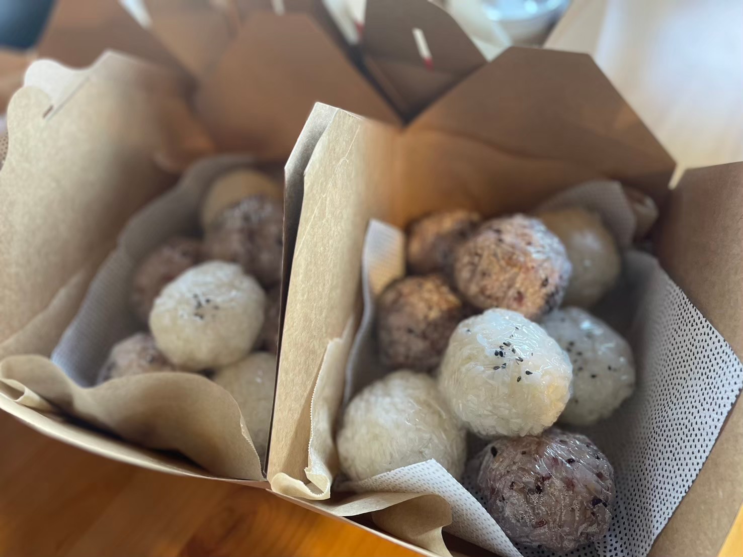 ◉ 無農薬七分付きの白と雑穀入りの2種類のおにぎりが8個入っています。